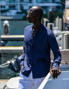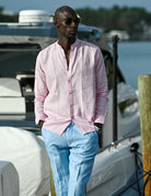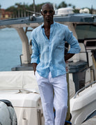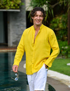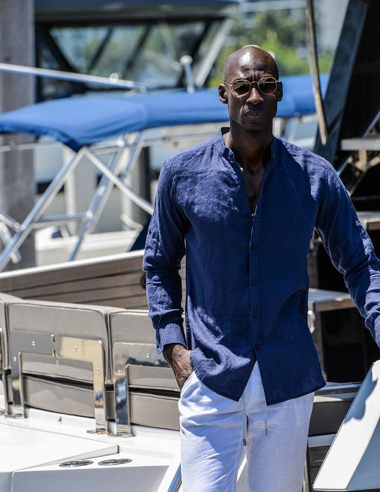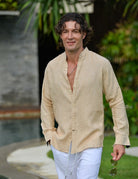 Exude effortless cool and refined style with our Mandarin Collar Linen Shirt. This men's mandarin collar linen shirt is the epitome of laid-back sophistication, offering a blend of comfort and dapper appeal. The long-sleeved linen shirt is designed for versatility, pairing seamlessly with luxury linen pants, casual shorts, or even stylish swim shorts for a beach-to-evening look. These comfortable Chinese collar linen shirts elevate your wardrobe with a touch of modern elegance. Perfect for men's resort wear, coastal lifestyle apparel, and versatile linen clothing, this shirt is your go-to for effortless style and undeniable cool.