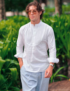 Transport your style to the sun-drenched courtyards of Marrakech with the Medina White Shirt, a Moroccan-inspired men's pintuck shirt offering a vintage twist on smart dressing. Crafted from 100% super-soft, lightweight cotton, this premium cotton shirt features a distinctive rounded pleated placket, reminiscent of traditional North African designs. We've fused modern tailoring with classic Moroccan influences to create a versatile men's shirt that seamlessly complements men's linen pants, chinos, or shorts for effortless style. The precise tailoring and flattering curved hem provide a structured yet comfortable, slim silhouette, evoking the refined elegance of a riad retreat. Discover vintage-inspired men's shirts, cultural men's apparel, and luxury travel wear perfect for stylish men's clothing. Embrace the timeless charm of the Medina shirt, your gateway to comfortable dress shirts with a touch of exotic flair, ideal as a men's casual button-downor a designer white shirt.