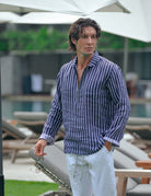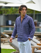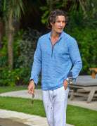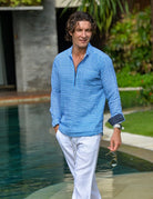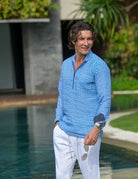 Experience laid-back elegance with our Sorrento Zip Opening Linen Shirt. This men's zip-opening linen shirt, featuring a unique half-curve collar, blends refined style with ultimate comfort. A practical front pocket and stylish curved hem enhance its versatility. Our signature enzyme wash creates an ultra-soft, perfectly worn-in feel, making this premium linen shirt an instant favorite. Ideal for luxury casual wear, coastal lifestyle apparel, men's travel linen shirts, and breathable summer shirts, it's the perfect choice for effortless sophistication.