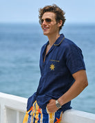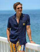Men's Tenerife Blanket Short Sleeve Camp Collar Linen Shirt with Distinctive Sun Embroidery on Pocket